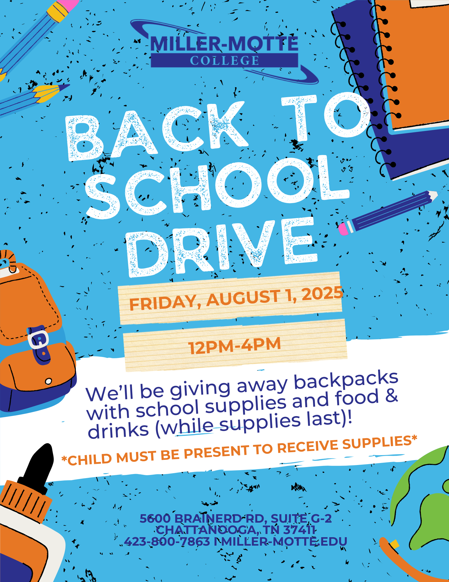 Get ready for the new school year with Miller-Motte College Chattanooga at our Back to School Drive on Friday, August 1st, 2025, from 12:00PM to 4:00PM.