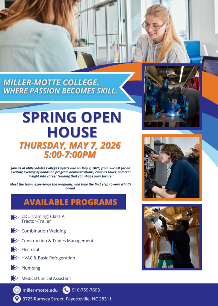 Take the next step toward your future at Miller-Motte College Fayetteville’s Spring Open House on Thursday, May 7, 2026, from 5:00–7:00 PM.
