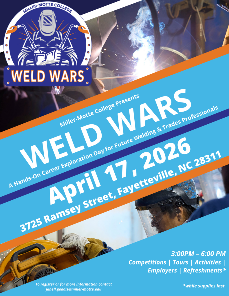 Miller-Motte College Fayetteville invites you to attend Weld Wars 2026, a hands-on career exploration event for students and community members interested in welding and skilled trades careers. This interactive event is designed to showcase the training, equipment, and real-world skills students learn through Miller-Motte College’s hands-on programs.